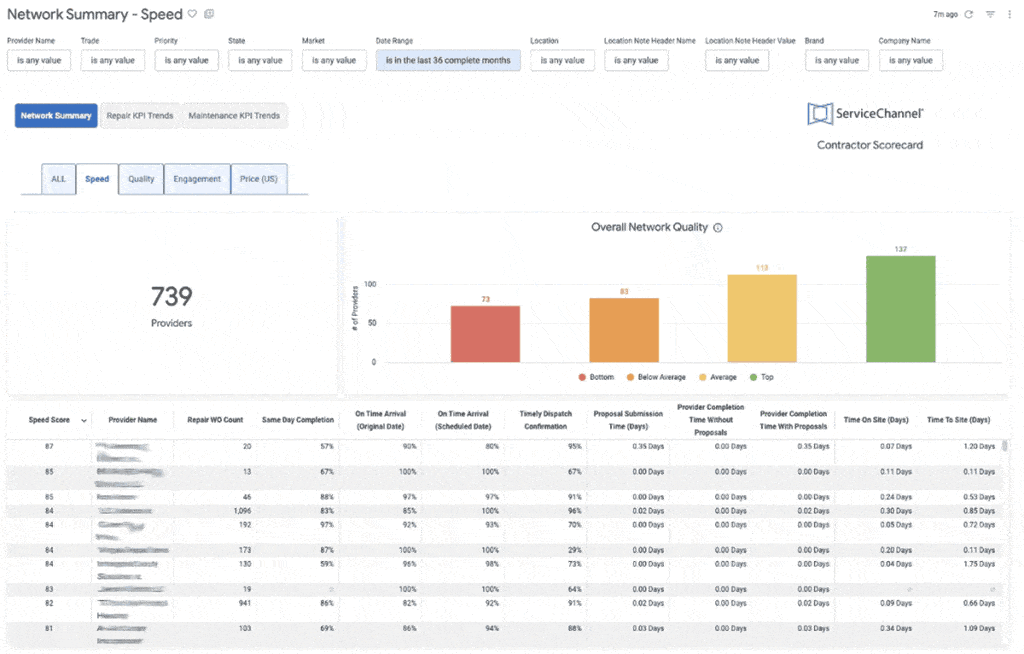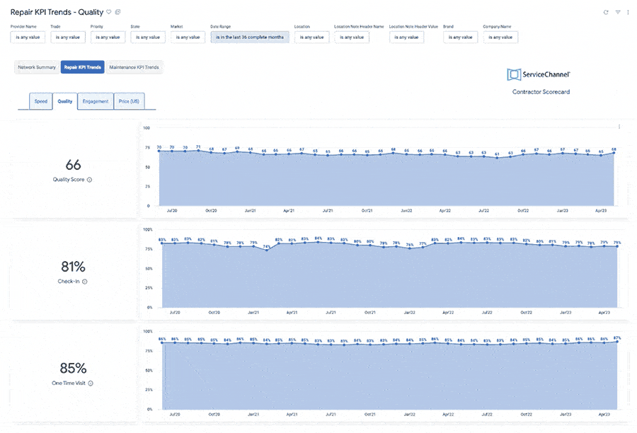 ServiceChannel evaluates provider performance across four key dimensions of service: Speed, Quality, Price, and Engagement Scores. Each score is calculated from a weighted set of key KPIs.