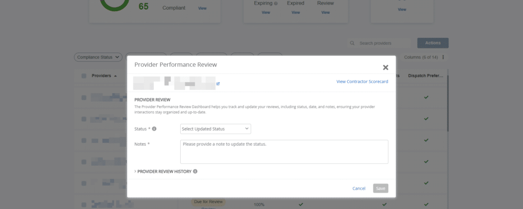 Once a new provider is added to your network and demonstrates solid performance on their initial work orders, you can start tracking their reviews along with your other providers in Compliance Manager. Early and frequent reviews of new providers are important so you can: