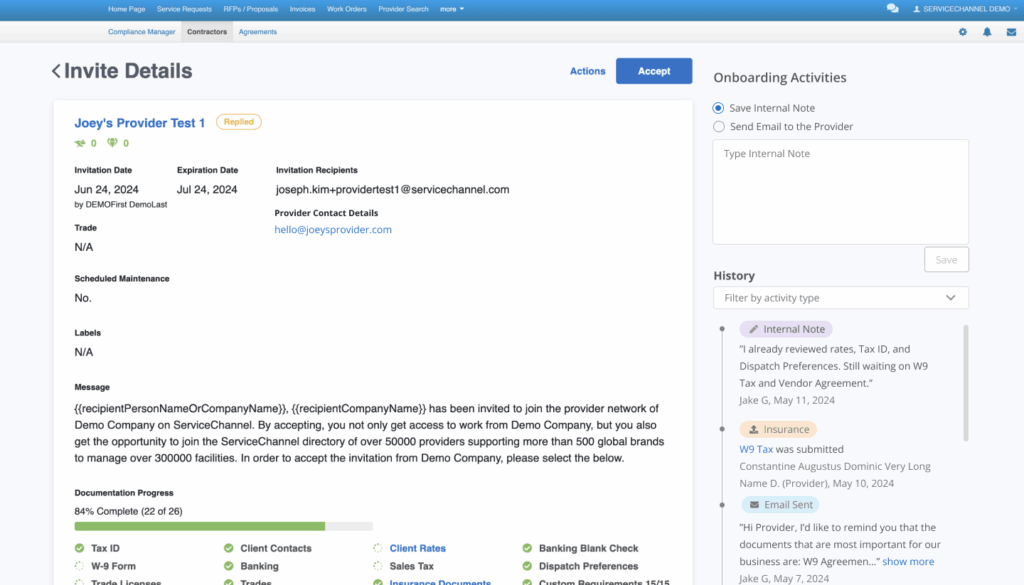 To see a provider’s history, open the menu icon on the homepage, select Compliance, then go to Contractors and choose Invitations.