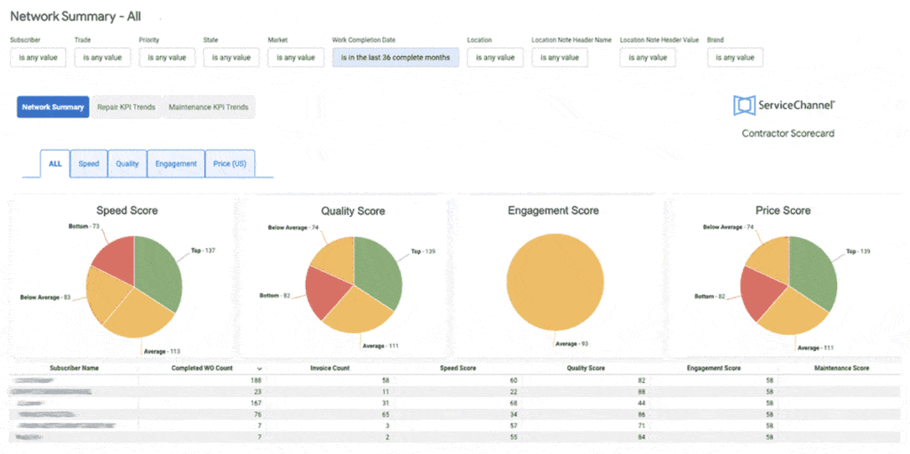 ServiceChannel evaluates provider performance across four key dimensions of service: Speed, Quality, Price, and Engagement Scores. Each score is calculated from a weighted set of key KPIs.