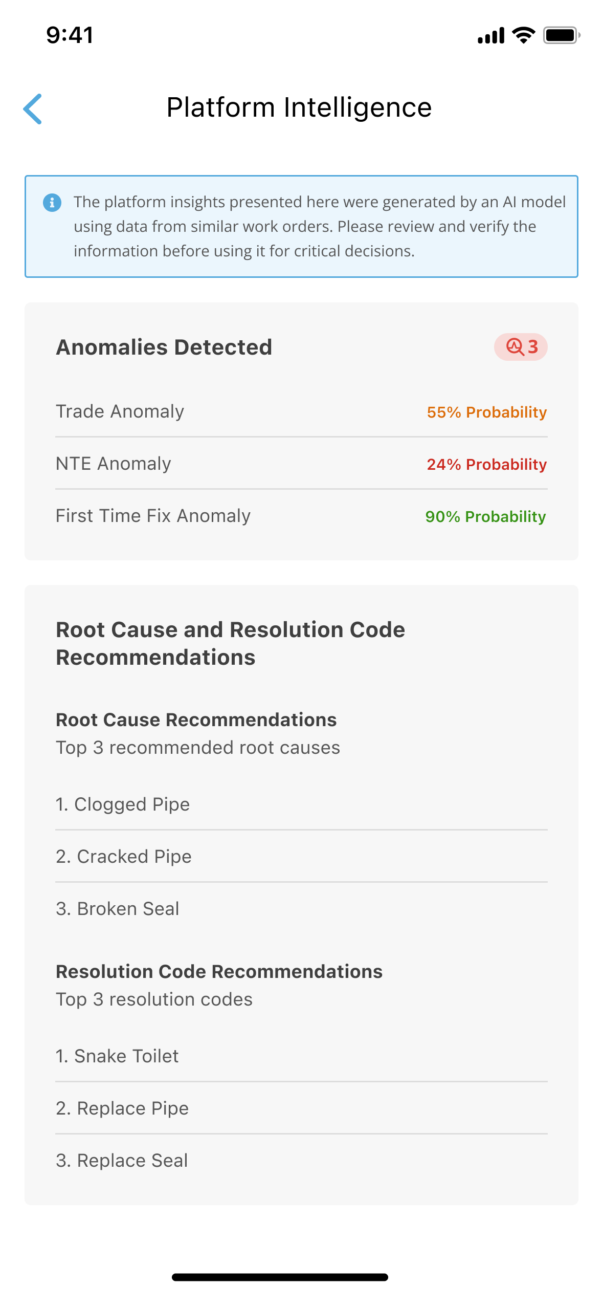 - Predict problems and solutions. AI calculates the most likely resolution and root cause codes based on similar work orders, so you and your providers can be prepared.