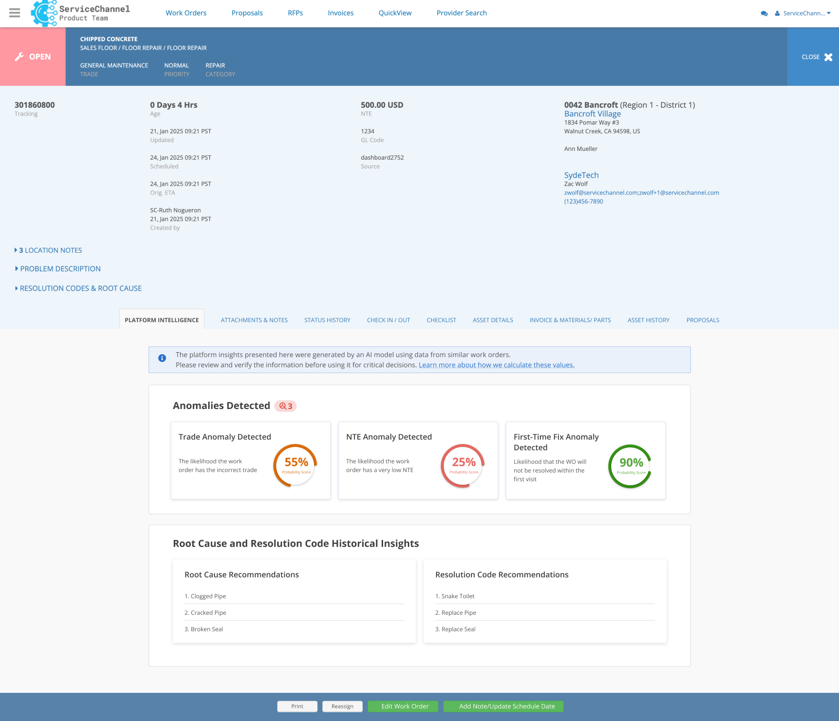 - New! Avoid work order delays with ServiceChannel AI (Beta). Flag miscoded trades, low NTEs, and multi‑visit risks the moment a work order is created.