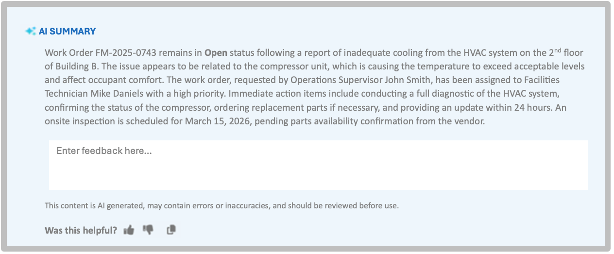 - Stay on top with instant AI summaries of work orders
