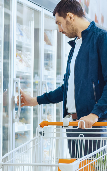 woman in purple work shirt in grocery store checking stock of cooler with smartphone camera